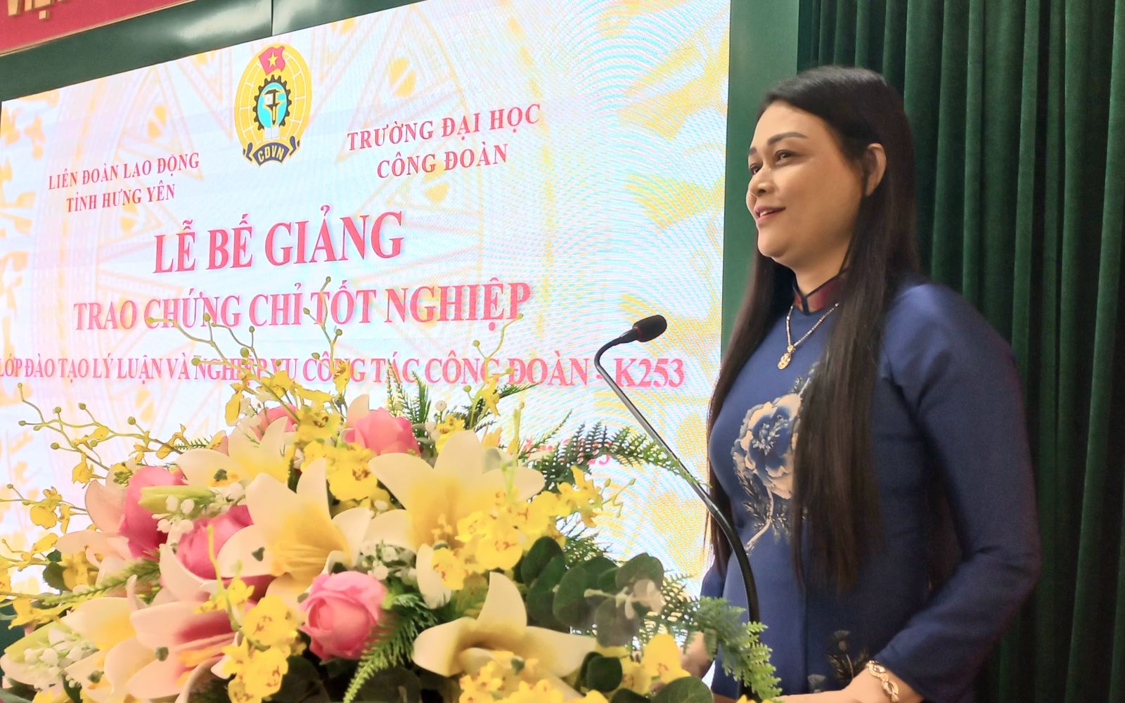 Đồng chí Nguyễn Thị Thanh Tuyết - Chủ tịch LĐLĐ tỉnh Hưng Yên  phát biểu tại lễ bế giảng