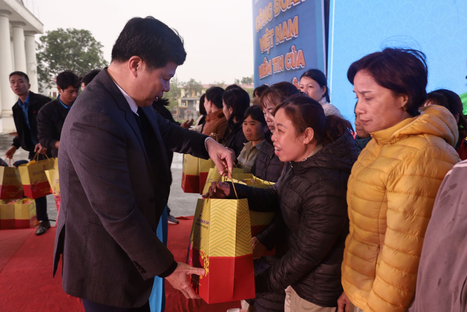 Ảnh: Đ/c Trần Quốc Toản, Phó Bí thư Thường trực Tỉnh ủy, Chủ tịch Ủy ban MTTQ Việt Nam tỉnh trao quà cho đoàn viên, người lao động tại Chương trình