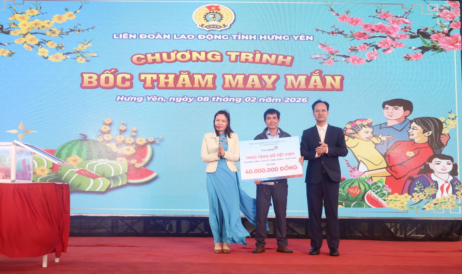 Tại Chương trình “Chợ Tết Công đoàn – Xuân 2026” năm nay, Liên đoàn Lao động tỉnh tổ chức trao 200 suất quà của các đồng chí Lãnh đạo các Ủy ban Quốc hội cho đoàn viên, người lao động có hoàn cảnh khó khăn, mỗi suất tiền mặt 01 triệu đồng và 01 túi quà trị giá 300.000đ; tổ chức chương trình bốc thăm may mắn với 228 giải Khuyến khích có giá trị từ 300 nghìn đồng đến 01 triệu đồng, 3 giải Ba – mỗi giải là 1 sổ tiết kiệm 5 triệu đồng, 2 giải Nhì – mỗi giải 1 sổ tiết kiệm 10 triệu đồng, 1 giải Nhất – sổ tiết kiệm 30 triệu đồng, 1 giải Đặc biệt – sổ tiết kiệm 40 triệu đồng.