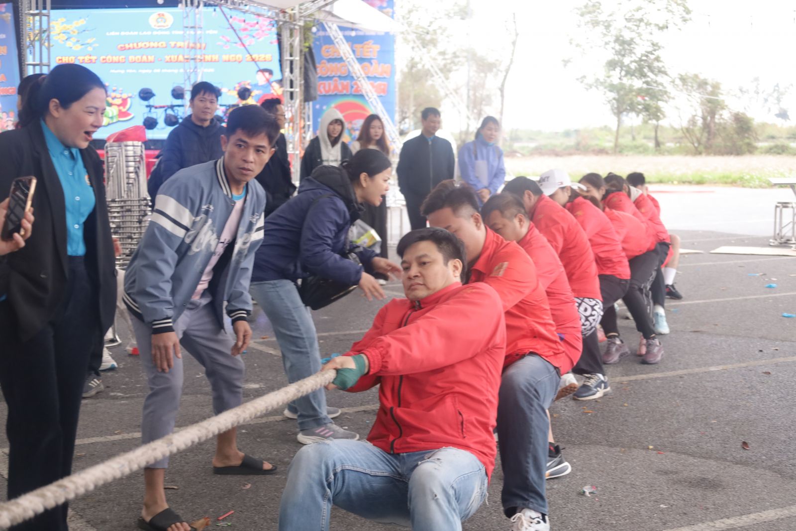 Giữa không gian rộn ràng Chợ Tết Công đoàn, đoàn viên, người lao động còn được tham gia các hoạt động văn hóa, vui chơi, giải trí mang đậm bản sắc truyền thống như Kéo co, nhảy bao bố… đã tạo không gian vui tươi, phấn khởi cho người lao động sau những ngày lao động mệt mỏi.