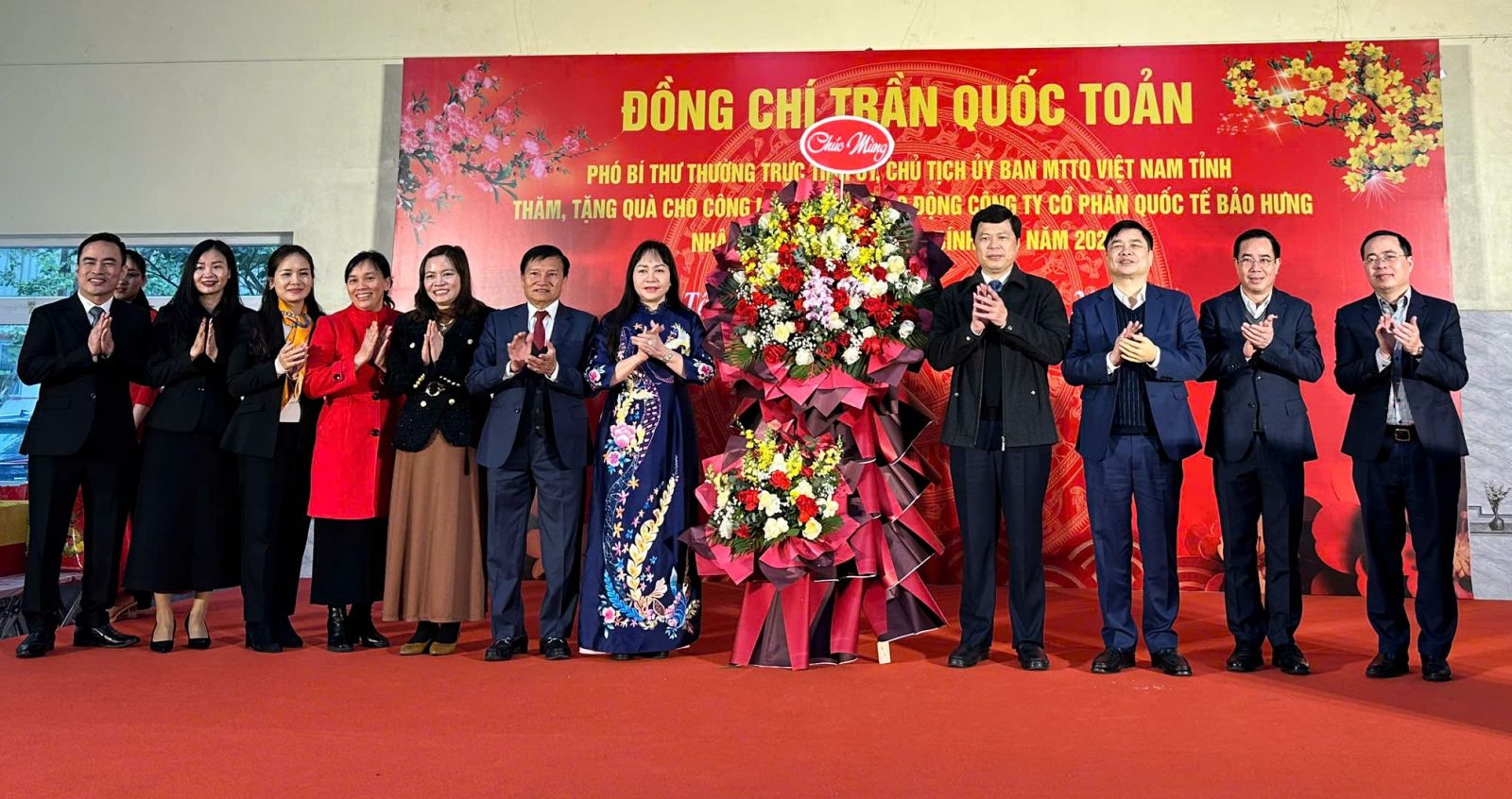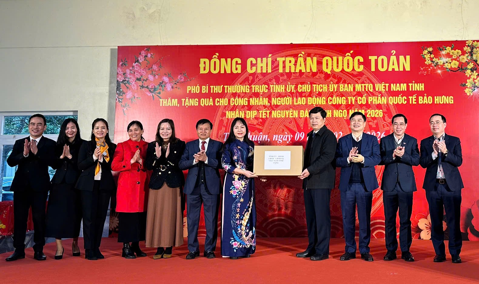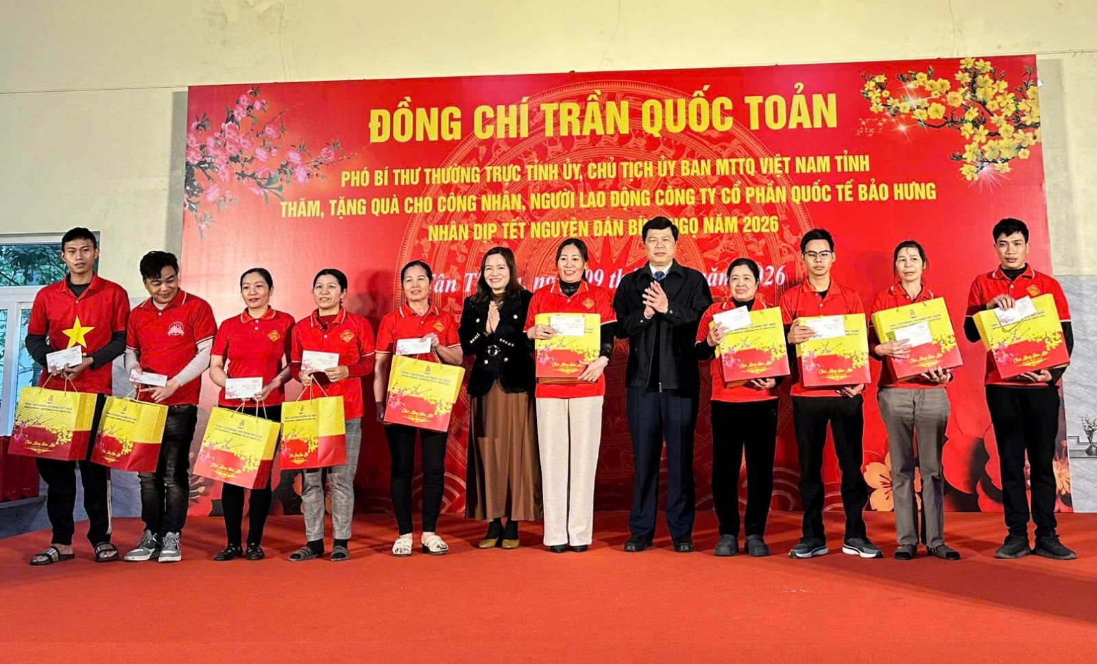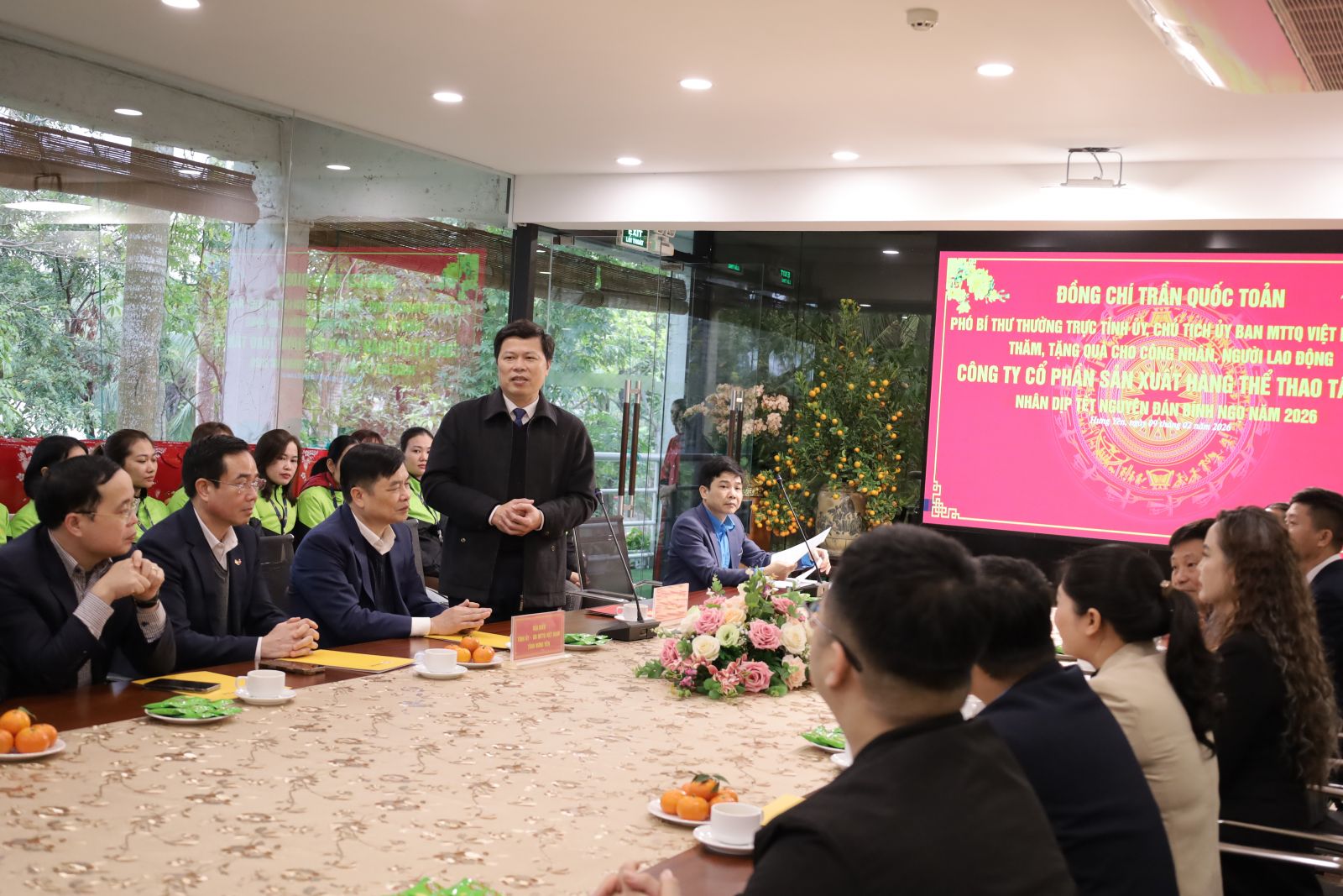 Nhân dịp chào đón Tết Nguyên đán Bính Ngọ, sáng ngày 09.2, đồng chí Trần Quốc Toản, Phó Bí thư Thường trực Tỉnh ủy, Chủ tịch Ủy ban Mặt trận Tổ quốc Việt Nam tỉnh đến thăm và trao quà Tết cho đoàn viên, người lao động tại Công ty Cổ phần Quốc tế Bảo Hưng (tại Cụm công nghiệp Tân Minh, xã Tân Thuận) và Công ty Cổ phần sản xuất hàng thể thao – Chi nhánh Thái Bình (tại Khu công nghiệp Nguyễn Đức Cảnh, phường Trần Hưng Đạo).