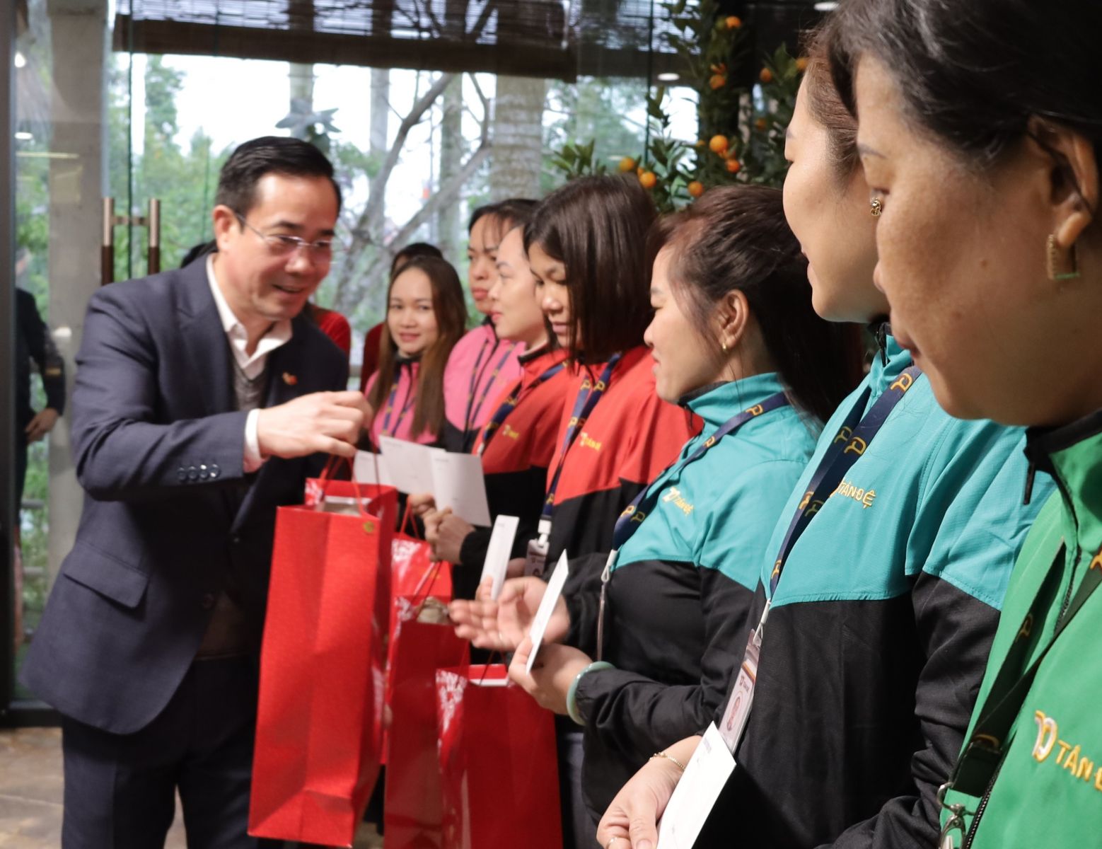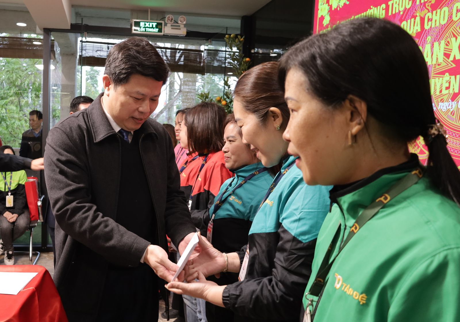 Đoàn công tác đã đến thăm, chúc Tết và tặng quà cho đoàn viên, người lao động, trao 150 suất quà Tết cho công nhân, người lao động có hoàn cảnh khó khăn và đặc biệt khó khăn tại Công ty Cổ phần quốc tế Bảo Hưng và Công ty Cổ phần sản xuất hàng thể thao – Chi nhánh Thái Bình (Công ty Tân đệ).