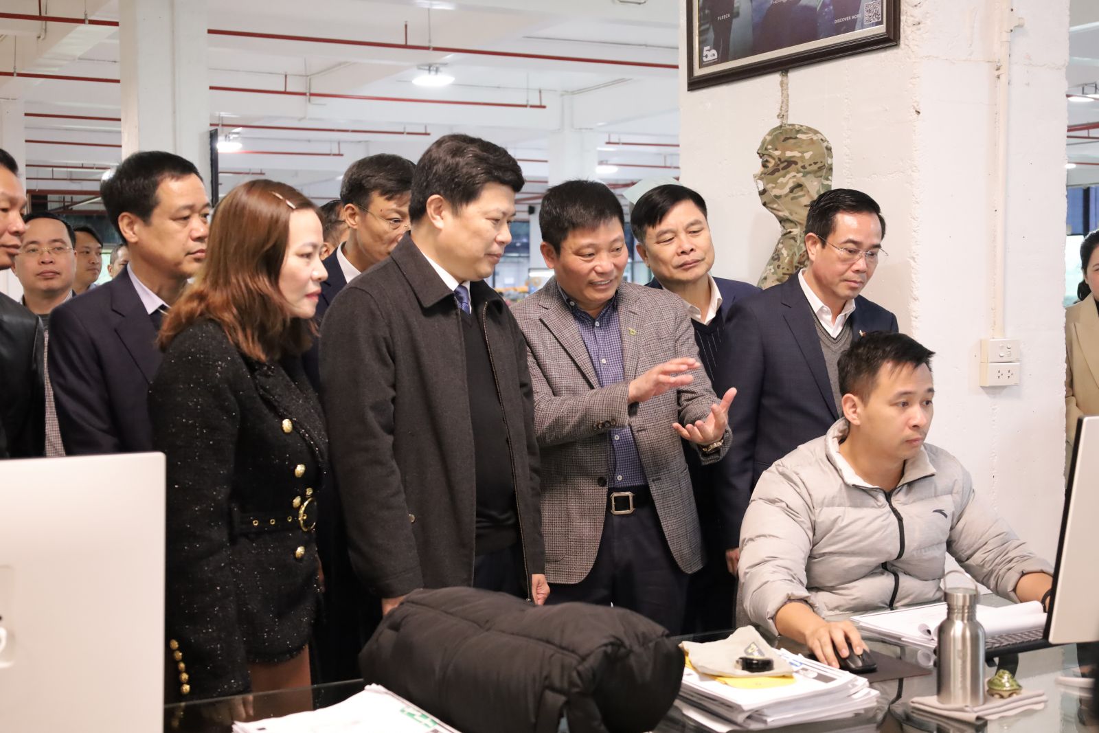Đồng chí Trần Quốc Toản, Phó Bí thư Thường trực Tỉnh ủy, Chủ tịch Ủy ban MTTQ Việt Nam tỉnh và các đại biểu tham quan xưởng sản xuất của Công ty Tân Đệ.