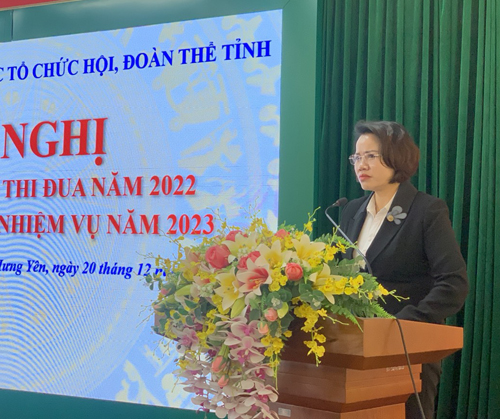 Đồng chí Nguyễn Thị Thanh Tuyết, Tỉnh ủy viên, Chủ tịch LĐLĐ tỉnh phát biểu tại Hội nghị tổng kết khối thi đua MTTQ và các Hội đoàn thể tỉnh