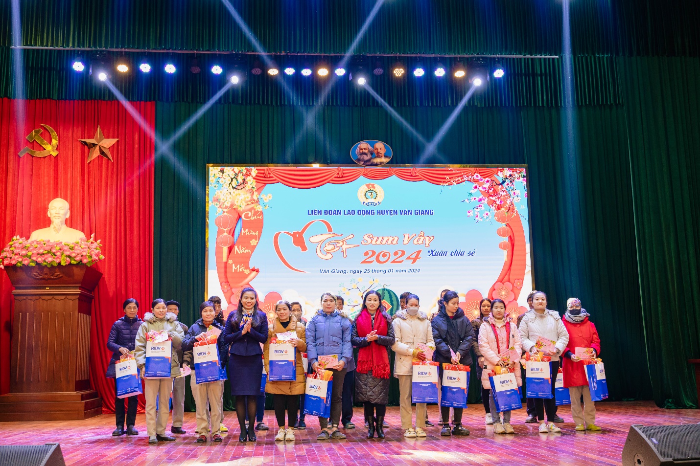 Ngày 25/01/2024, Liên đoàn Lao động huyện Văn Giang tổ chức chương trình “Tết sum vầy - Xuân chia sẻ” năm 2024. Dự chương trình có các đồng chí Lê Văn Hưng - Uỷ viên Ban Thường vụ Tỉnh uỷ, Bí thư Huyện uỷ Văn Giang; Chu Ngọc Hoa Liễu - Phó Chủ tịch LĐLĐ tỉnh Hưng Yên; lãnh đạo Ban Dân vận Huyện uỷ cùng lãnh đạo một số phòng, ban, ngành, đoàn thể huyện; đại diện Ngân hàng Viettinbank CN Bắc Hưng Yên, Ngân hàng BIDV CN Bắc Hưng Yên, Công ty Cổ phần Anvy…